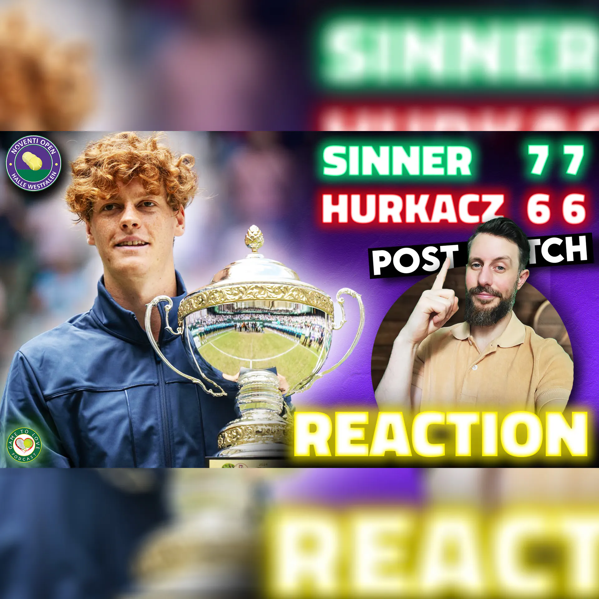 Jannik Sinner defeats Hubert Hurkacz 7-6(8) 7-6(2) in the final of the Halle Open 2024. Is he now the favourite to win Wimbledon? ❤️ SUBSCRIBE TO GTL: https://bit.ly/35JyOhz ▶️ JOIN YOUTUBE MEMBERSHIP: https://bit.ly/3Fk9rSr 💰 SUPPORT CHANNEL: https://www.paypal.com/paypalme/g2lp 🔥 PATREON: https://www.patreon.com/gametolove 🏆 JOIN TNNS BRACKET LEAGUE: https://tnnslive.com 💬 GTL DISCORD: https://discord.gg/55t6PNFwvy 🛒 MERCH: https://etsy.com/uk/shop/GameToLove 🎮 TWITCH: https://www.twitch.tv/gametolovepodcast 📸 FOLLOW US ON INSTAGRAM: https://bit.ly/2LQZ0Qy 📲 FOLLOW US ON TWITTER: https://bit.ly/2RmTmIK 🔵 LIKE US ON FACEBOOK: https://bit.ly/3ha6Z7P 🤖 FOLLOW OUR SUBREDDIT: https://bit.ly/3JsULUq ⏰ Time Stamps ⏰ 0:00 Intro 0:23 Reaction 7:06 Interviews 9:25 Outro Thanks for watching, make sure you LIKE the video, SUBSCRIBE and hit the bell to be notified of all our future tennis podcasts & watch-alongs. Download TNNS App: https://www.downloadtennis.com/ You can find us on Spotify & Apple Podcasts too: https://linktr.ee/gtltennispodcast All of your support is appreciated! Business: [email protected] #tennis #atp #sinner Learn more about your ad choices. Visit podcastchoices.com/adchoices