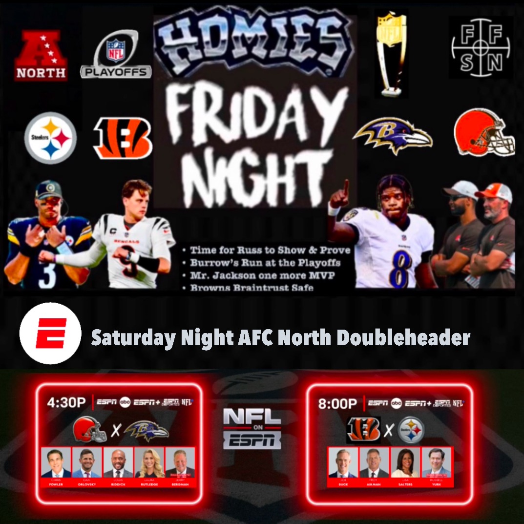 Homies Friday Night, join Tate, Big-G. Pay & B-Dirt as we talk about everything AFC NORTH headlining into the final week of the 2024 regular season. It’s time for Russell Wilson to do what he was brought to Pittsburgh to do, win in January. Joe Burrow and the Bengals are still chasing the tournament, in order to make that happen they have to win against the Steelers. The Ravens got their swagger back, can Lamar Jackson win his third NFL MVP? Lastly, are Head Coach Kevin Stefanski and General Manager Andrew Berry jobs safe this offseason? Tap-in to listen and talk about it on the “Homies” podcast. Learn more about your ad choices. Visit megaphone.fm/adchoices