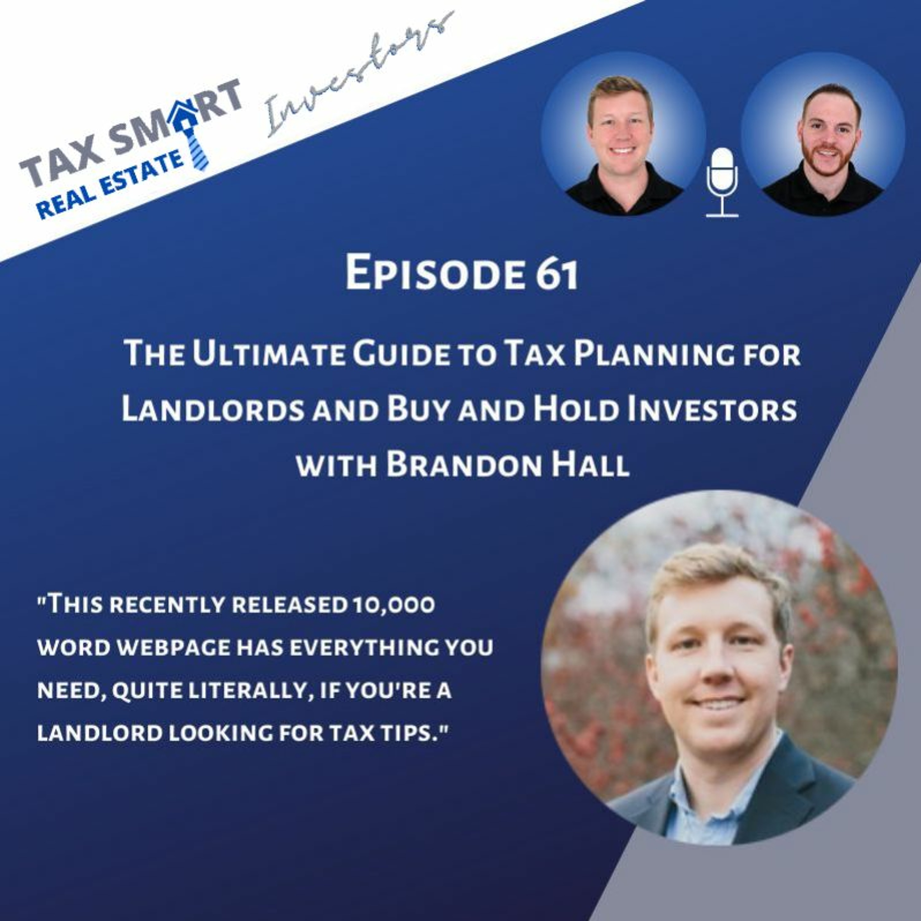In this episode, The Real Estate CPA CEO Brandon Hall flies solo to dive into several sections of the recently published Ultimate Guide to Tax Planning for Landlords and Buy and Hold Investors. Find the guide on our website: https://www.therealestatecpa.com/the-ultimate-guide-to-tax-planning-for-landlords-and-buy-hold-real-estate-investors Join our Facebook group, the one-stop-shop for real estate investors to learn about tax strategy and stay up to date on changing tax laws: www.facebook.com/groups/taxsmartinvestors For an initial consultation from Hall CPA, PLLC visit www.therealestatecpa.com/become-client Subscribe to our YouTube channel: www.youtube.com/c/therealestatecpa The Tax Smart Real Estate Investors podcast is for general information purposes only and is not intended to provide, and should not be relied on for, tax, legal, or accounting advice. Information on the podcast may not constitute the most up-to-date legal or other information. No reader, user, or listener of this podcast should act or refrain from acting on the basis of information on this podcast without first seeking legal and tax advice from counsel in the relevant jurisdiction. Only your individual attorney and tax advisor can provide assurances that the information contained herein – and your interpretation of it – is applicable or appropriate to your particular situation. Use of, and access to, this podcast or any of the links or resources contained or mentioned within the podcast show and show notes do not create a relationship between the reader, user, or listener and podcast hosts, contributors, or guests. Always consult your own tax, legal, and accounting advisors before engaging in any transaction.