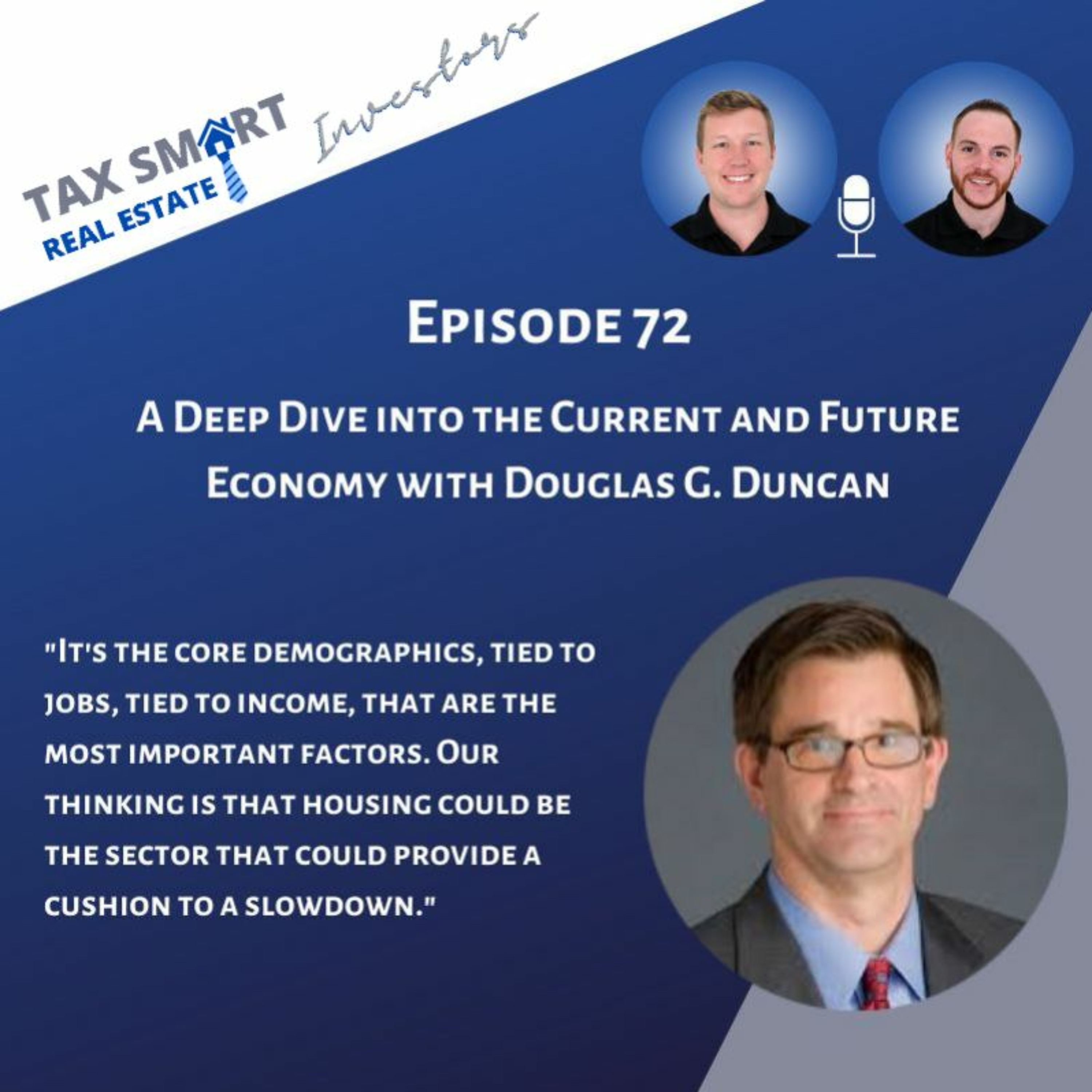 Today we're joined by Senior Vice President and Chief Economist at Fannie Mae, Douglas G. Duncan. Doug is responsible for forecasts for the economy, the housing market, and the mortgage market. Doug also oversees strategic research regarding the potential impact of external factors on the housing industry. Named one of Bloomberg's 50 Most Influential People in Real Estate, Doug is Fannie Mae's source for info and analysis on demographics and the external business and economic environment. In today's episode, we will discuss the current market, what the future holds for the housing market, supply and demand, interest rates, unemployment trends, the inverted yield curve, and how the next recession may impact investors. Learn more about Doug and his work: https://www.fanniemae.com/ Join our Facebook group, the one-stop-shop for real estate investors to learn about tax strategy and stay up to date on changing tax laws: www.facebook.com/groups/taxsmartinvestors For an initial consultation from Hall CPA, PLLC visit www.therealestatecpa.com/become-client Subscribe to our YouTube channel: www.youtube.com/c/therealestatecpa The Tax Smart Real Estate Investors podcast is for general information purposes only and is not intended to provide, and should not be relied on for, tax, legal, or accounting advice. Information on the podcast may not constitute the most up-to-date legal or other information. No reader, user, or listener of this podcast should act or refrain from acting on the basis of information on this podcast without first seeking legal and tax advice from counsel in the relevant jurisdiction. Only your individual attorney and tax advisor can provide assurances that the information contained herein – and your interpretation of it – is applicable or appropriate to your particular situation. Use of, and access to, this podcast or any of the links or resources contained or mentioned within the podcast show and show notes do not create a relationship between the reader, user, or listener and podcast hosts, contributors, or guests. Always consult your own tax, legal, and accounting advisors before engaging in any transaction.