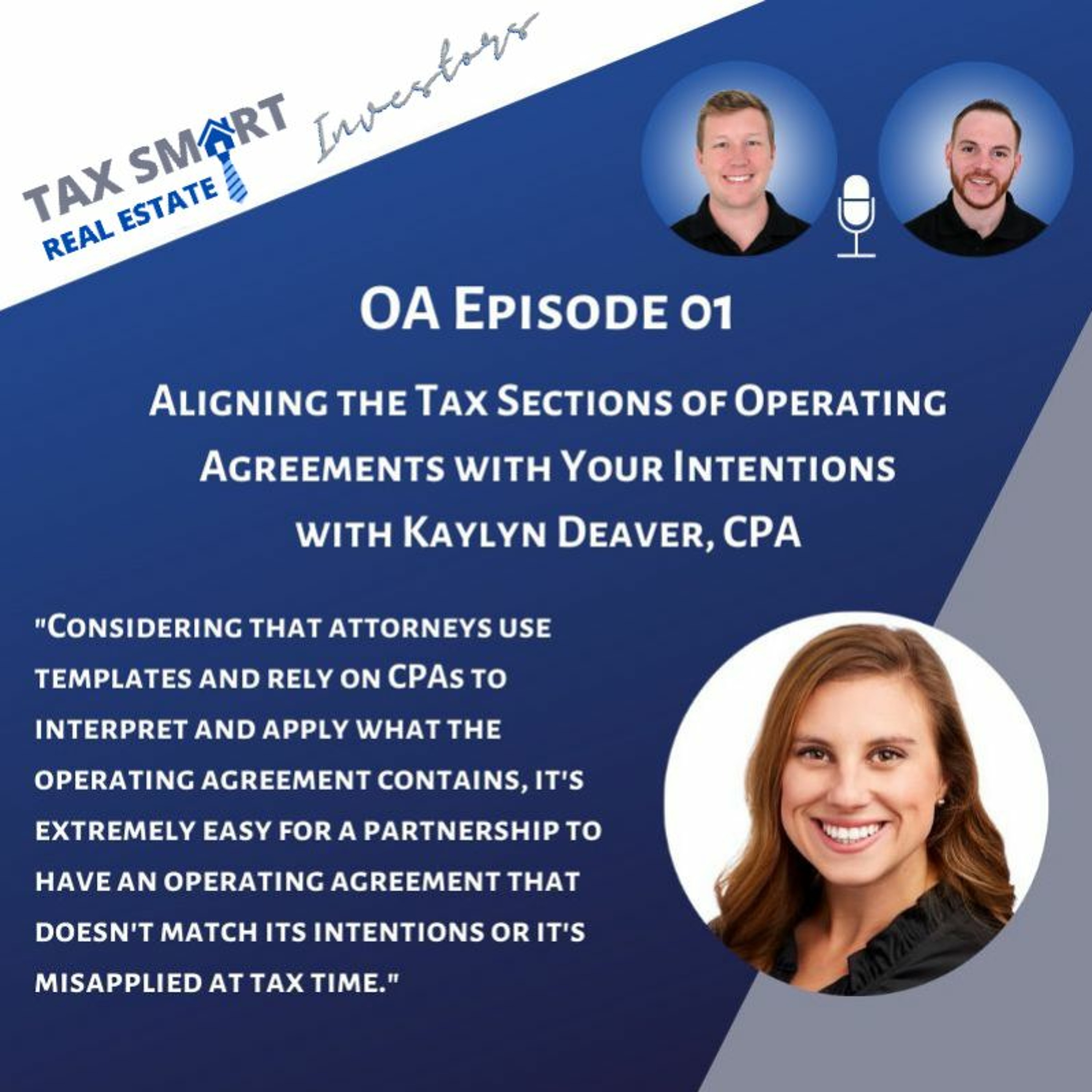 In this episode, Thomas is joined by Kaylyn Deaver, CPA, a Tax Manager here at The Real Estate CPA! We will discuss operating agreements, specifically the tax components of operating agreements and why it's important that you have your CPA involved in the creation and review of the agreement. Join our Facebook group, the one-stop-shop for real estate investors to learn about tax strategy and stay up to date on changing tax laws: www.facebook.com/groups/taxsmartinvestors For an initial consultation from Hall CPA, PLLC visit www.therealestatecpa.com/become-client Subscribe to our YouTube channel: www.youtube.com/c/therealestatecpa The Tax Smart Real Estate Investors podcast is for general information purposes only and is not intended to provide, and should not be relied on for, tax, legal, or accounting advice. Information on the podcast may not constitute the most up-to-date legal or other information. No reader, user, or listener of this podcast should act or refrain from acting on the basis of information on this podcast without first seeking legal and tax advice from counsel in the relevant jurisdiction. Only your individual attorney and tax advisor can provide assurances that the information contained herein – and your interpretation of it – is applicable or appropriate to your particular situation. Use of, and access to, this podcast or any of the links or resources contained or mentioned within the podcast show and show notes do not create a relationship between the reader, user, or listener and podcast hosts, contributors, or guests. Always consult your own tax, legal, and accounting advisors before engaging in any transaction.